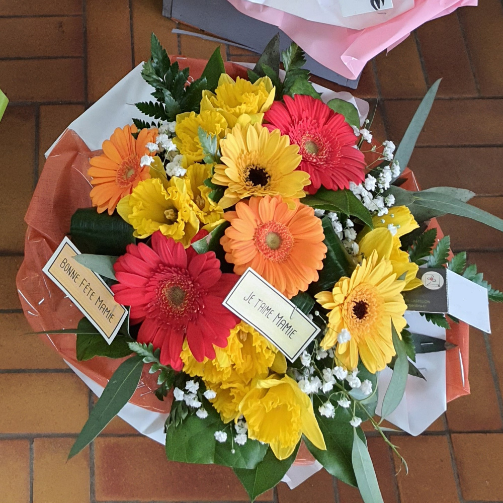 Bouquet de germinis, jonquilles et gypsophile, disponible avec ou sans bulle d’eau. Disponible en plusieurs coloris de germinis.