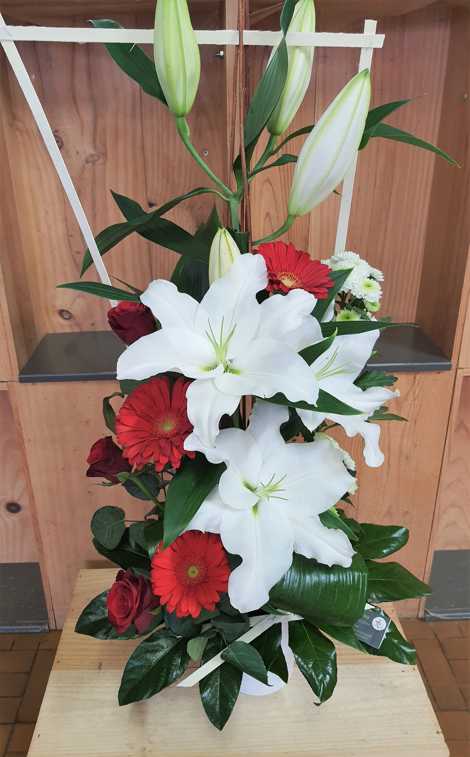 Composée de lys, de roses rouges, de gerberas et de santini, alstro et fleurs de saison.