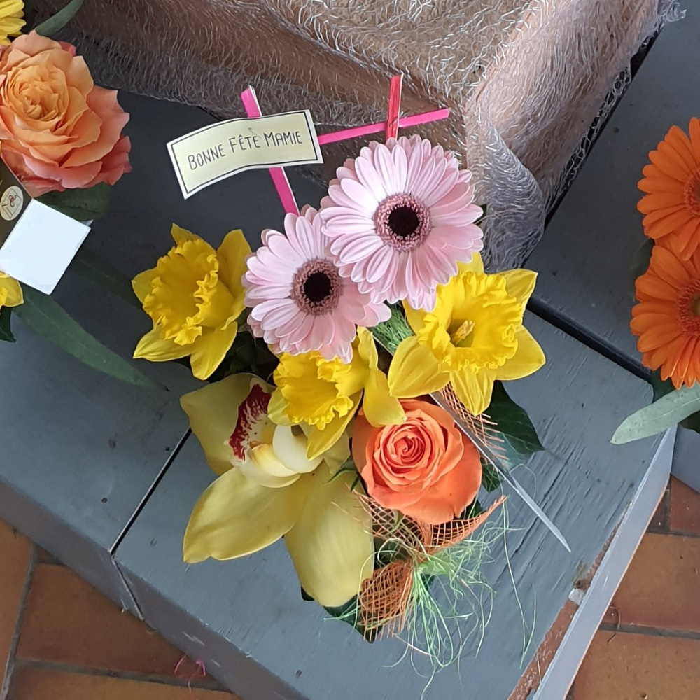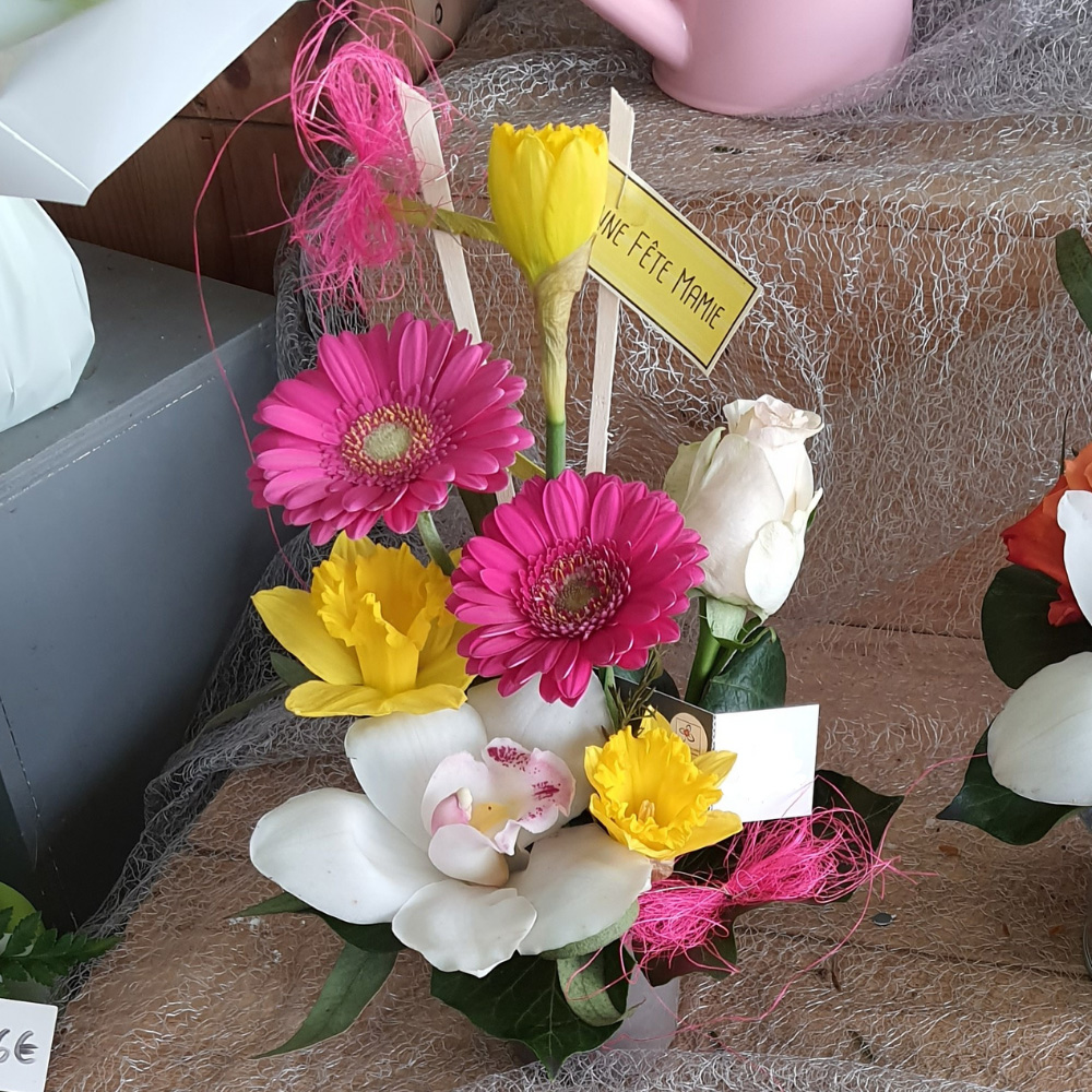 Composition florale dans son pot en céramique, composée de rose, germini, jonquille et cymbidium. Disponible en différents coloris.