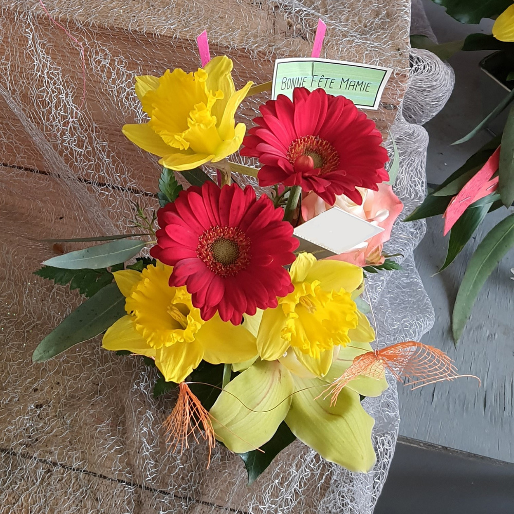 Composition florale composée de rose, germini, jonquille et cymbidium.