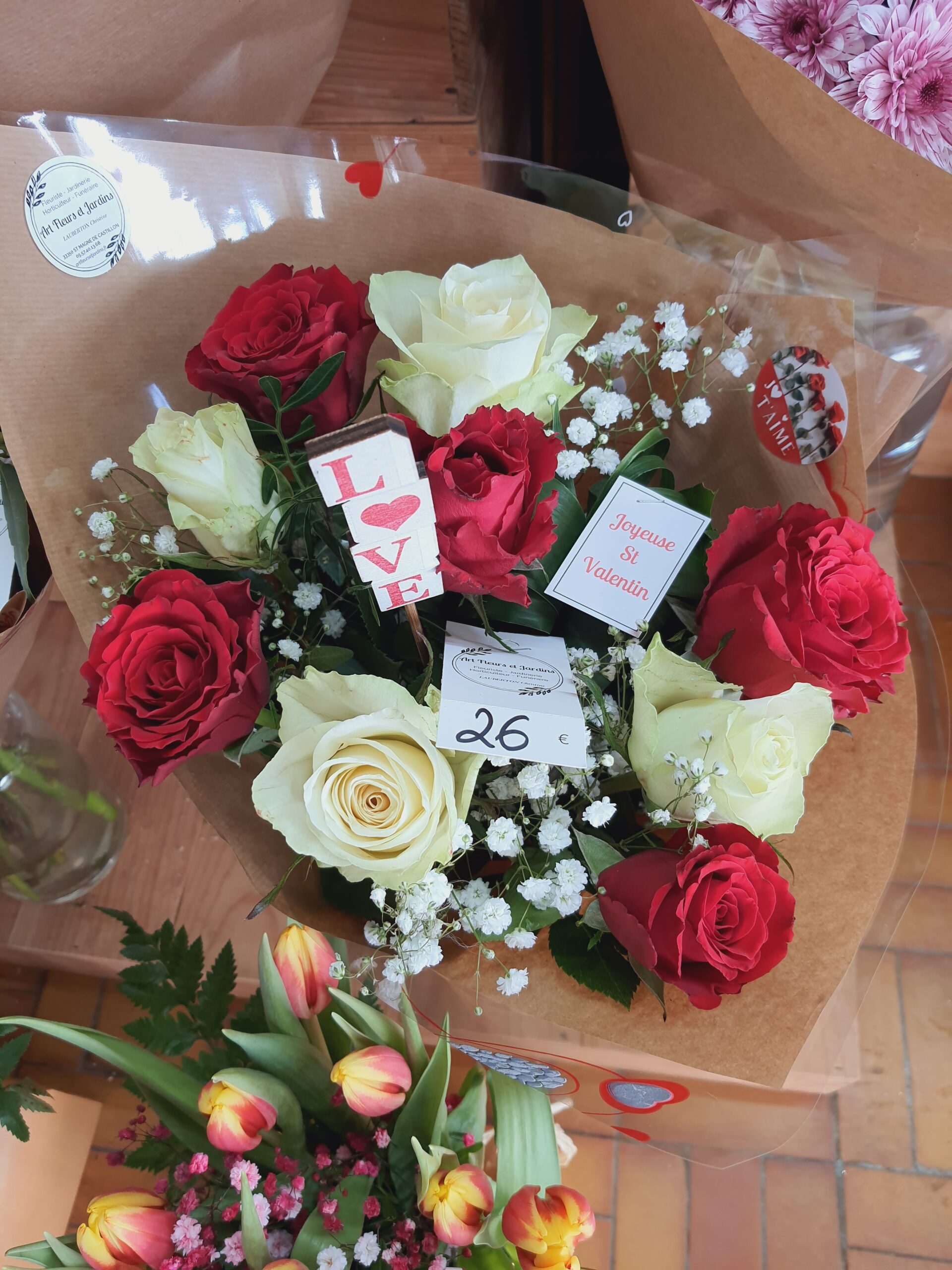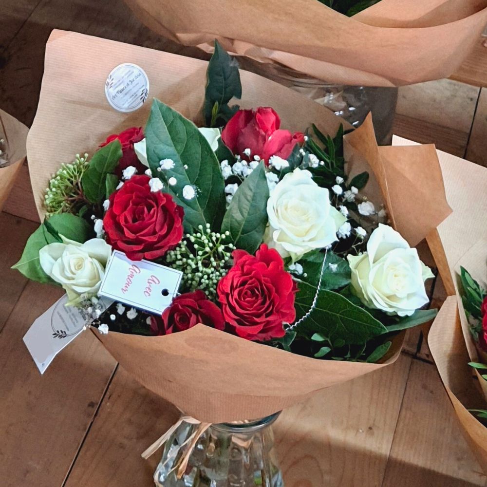 Un beau bouquet composé de 9 roses rouges et blanches moyens boutons accompagnées de leur gypsophile et de verdure. Offrir 9 roses, c’est promettre à l’être aimé un amour éternel.