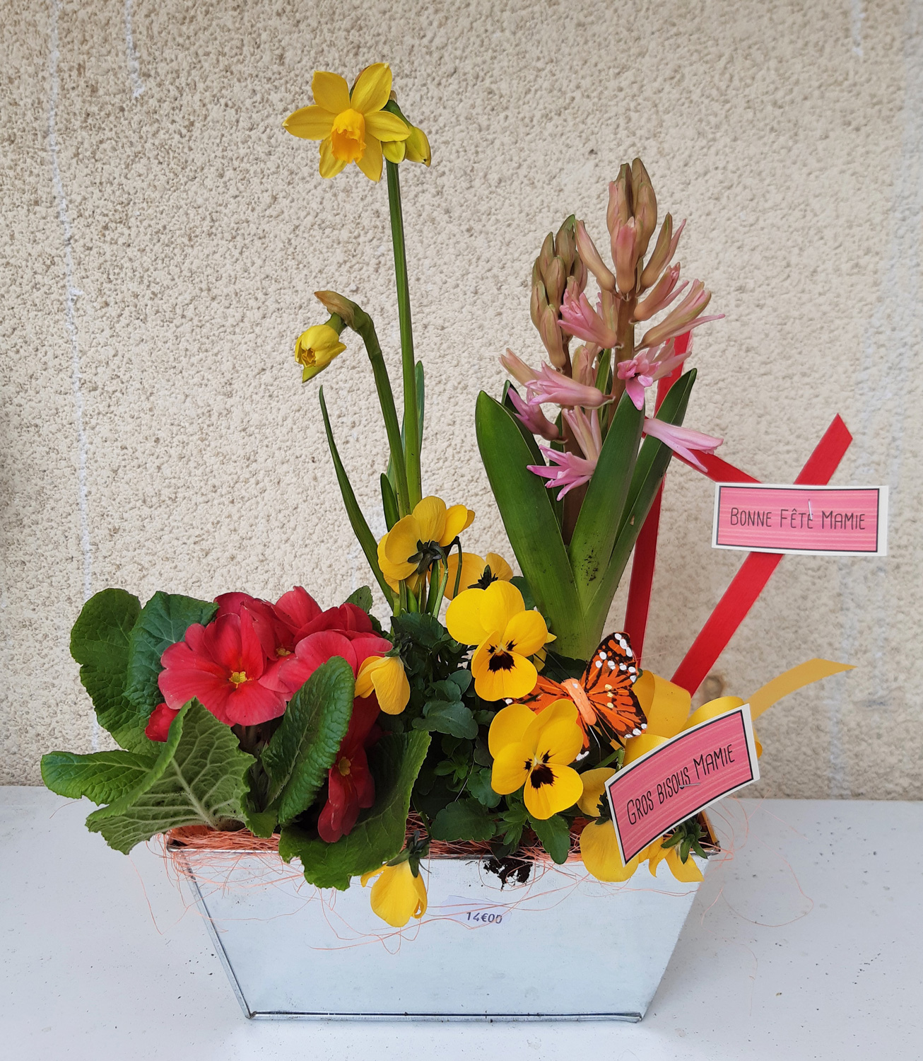 Une jolie composition de 4 plantes dans sa jardinière en zinc. Parfaite pour mettre sur la fenêtre de mamie !